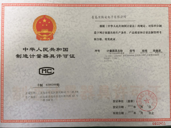 我公司是青島市具有國家質(zhì)量技術(shù)監(jiān)督部門頒發(fā)的計(jì)量器具生產(chǎn)許可證的生產(chǎn)企業(yè);獲得國家防爆電氣產(chǎn)品質(zhì)量監(jiān)督檢驗(yàn)中心頒發(fā)的防爆合格證;獲得國家公安部消防產(chǎn)品合格評定中心頒發(fā)的消防產(chǎn)品形式認(rèn)可證書。